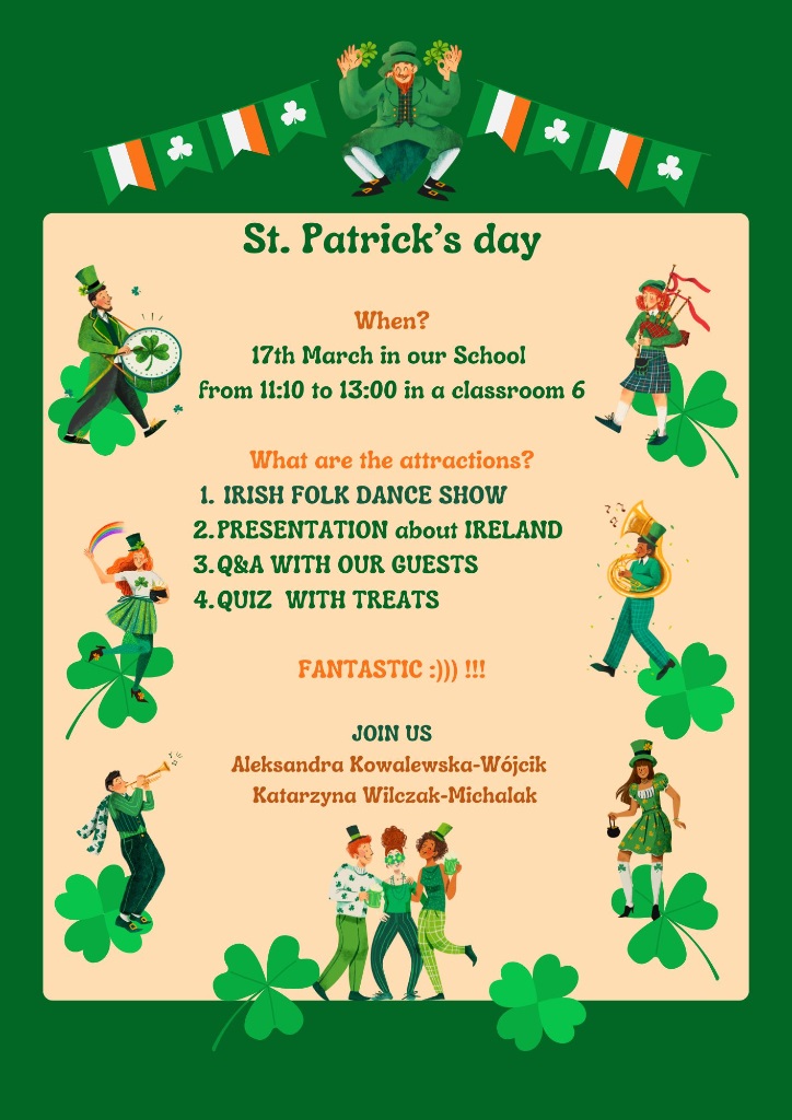 Zaproszenie na Dzień św. Patryka - Zespół Szkół Gastronomiczno - Hotelarskich (Technikum Nr 3, Branżowa Szkoła I stopnia Nr 3)